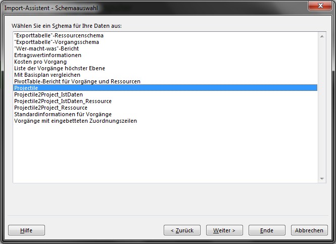 • Die CSV-Datei wird in MS Project mit Hilfe des Schemas “Projectile” geladen