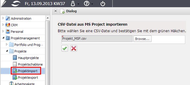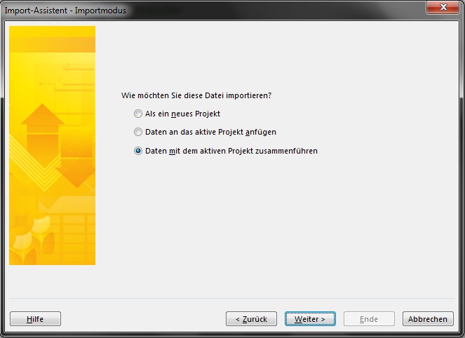 Wenn dieses Projekt wieder mit dem Projektplan von MS Project abglichen werden soll (beispielsweise nach der Planung und Erfassung um Istdaten oder Änderungen an der Projektstruktur zu übertragen), sind folgende Schritte notwendig: