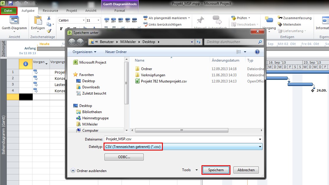 In MS Project wird in der Navigationsleiste der Eintrag “Datei” ausgewählt und dort die Option “Speichern unter” betätigt. Als Dateityp wird der Eintrag “CSV (Trennzeichen getrennt) (*.csv)” ausgewählt. Die Datei kann unter einem beliebigen Dateinamen mit der Endung .CSV abgespeichert werden. Der Speicherort ist beliebig.