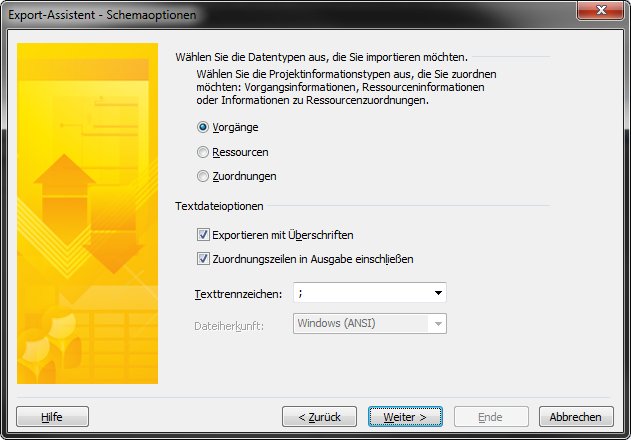 MS Project bietet mit den sogenannten Schemen die Möglichkeit, alle Projektdaten vorgangsbezogen in eine solche CSV-Datei exportieren zu lassen und auch wieder zu importieren. Wichtig ist, dass die richtigen Felder exportiert werden. Weitere Felder können in der Datei enthalten sein, werden aber ignoriert.