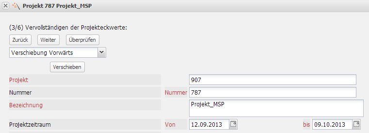 Im dritten Schritt werden die Eckwerte des Hauptprojektes definiert. Die Daten, die von MS Project kommen, sind in der Import-Datei abgespeichert und werden automatisch vorbelegt. In dieser Schablone können die Eckwerte des Hauptprojektes festgelegt oder verändert werden. Der Benutzer hat darüber hinaus hier die Möglichkeit, die komplette Projektstruktur zu verschieben, falls dies notwendig sein sollte. Dies geschieht mit dem Button “Verschieben”.
