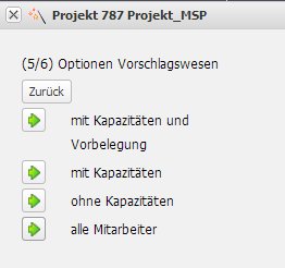 Im vierten Schritt werden die Arbeitspakete der importierten Projektstruktur konkretisiert (Option Vorschlagwesen, siehe Online-Hilfe). Diese Optionen sind für die Schablonen von Bedeutung und für den Import von MS Project Projekten mit Tätigkeiten. Falls die Ressourcen Mitarbeiter sind, kann die Option „alle Mitarbeiter“ ausgewählt werden.