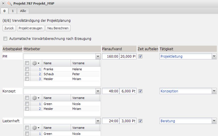 Im letzten Schritt werden die Arbeitspakete für das Projekt angezeigt. Hier besteht die Möglichkeit, einzelne Eckwerte der Aufgaben zu ändern (Bearbeiter, Aufwand, Tätigkeit).