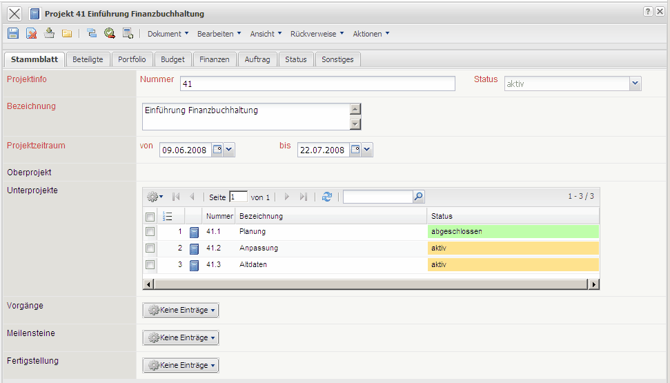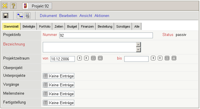 Der zentrale Dokumenttyp für die Verwaltung der Projektdaten ist der Typ Projekt. Hier werden die Eckwerte und die Struktur der Projekte festgelegt.