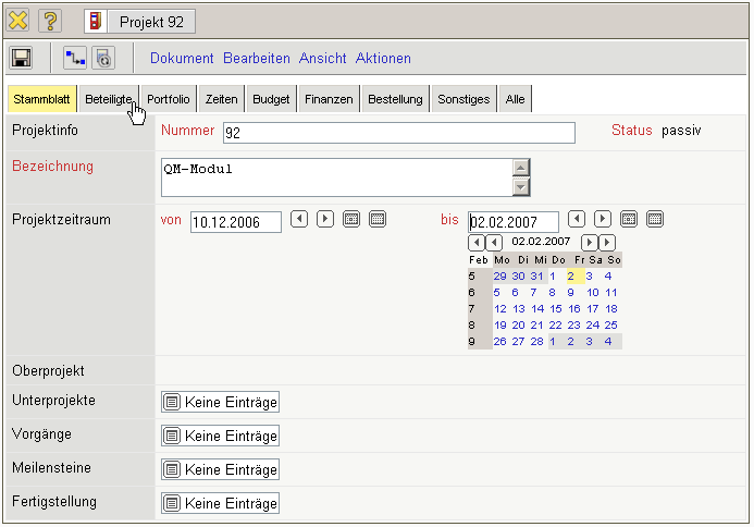 • Status: Dieses Feld kennzeichnet die Aktivität des Projektes. Vorbelegt ist dieses Feld mit dem Wert “passiv”.
