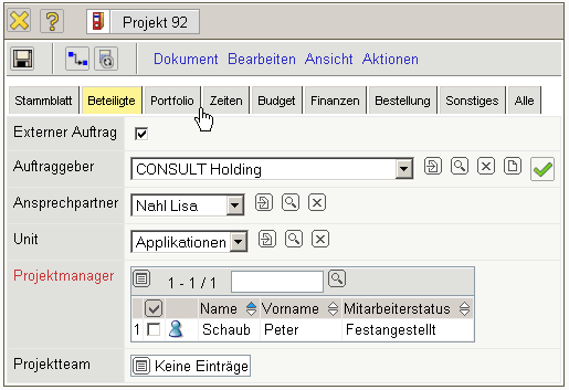 • Projektmanager: Wird vorbelegt mit dem Mitarbeiter, der das Projekt anlegt