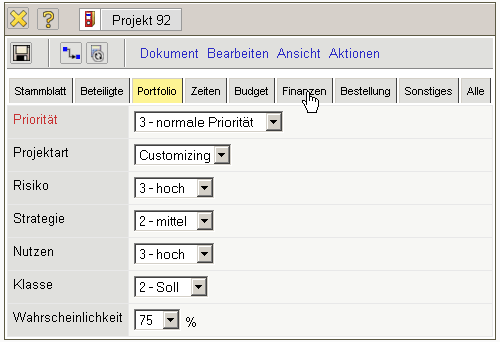 Nach der Definition der Felder des Reiters “Beteiligte” wird auf den Reiter “Portfolio” gewechselt. Hier werden die Priorität, Projektart, Projektwahrscheinlichkeit und weitere Attribute definiert. Die Wahrscheinlichkeit wird beim Vorschlagswesen verwendet und die Attribute dienen als Klassifizierungsmerkmale und können bei Auswertungen als Selektionskriterien verwendet werden.