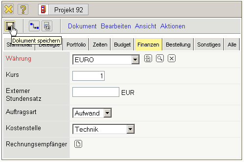 Im Reiter “Finanzen” werden u.a. die Projektwährung, die Auftragsart und die Kostenstelle (oder ggf. der Kostenträger) des Projektes definiert.