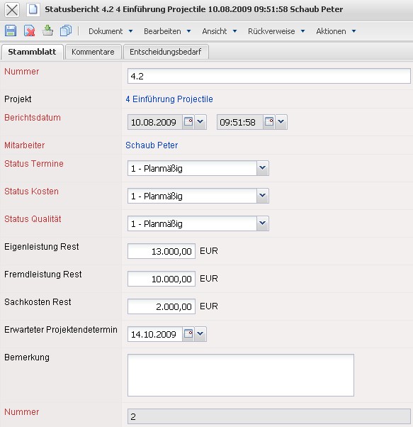 Es öffnet sich die Maske Statusbericht. Auf dem Reiter Stammblatt finden sich die grundlegenen Informationen über das Projekt, das Berichtsdatum, den anlegenden Mitarbeiter, die Status in Bezug auf Termine, Kosten und Qualität sowie finanzielle Eckwerte des Projekts. Die einzelnen Daten können hier eingegeben und angepasst werden.