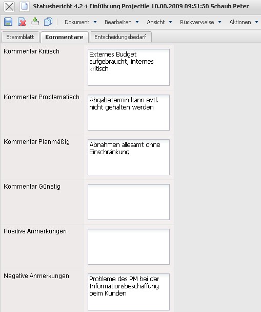 Auf dem Reiter Kommentare können in unterschiedlichen Kategorien Bemerkungen eingegeben werden. Kritische, problemeatische, planmäßige und günstoge Kommentare sowie weitere Anmerkungen werden hier vermerkt.