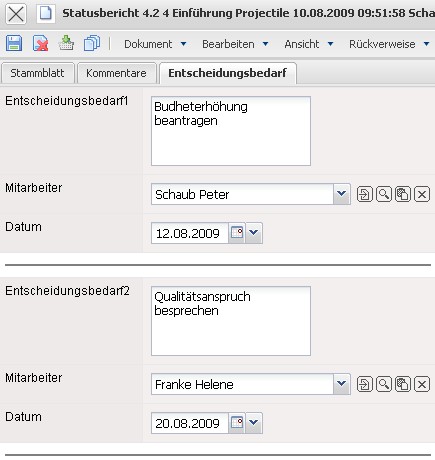 Der Reiter Entscheidungsbedarf bietet die Möglichkeit, bis zu zehn Entscheidungsbedarfe zu definieren und zu konkretierieren. Es kann jeweils ein Text, der verantwortliche Mitarbeiter und ein Datum hinterlegt werden.