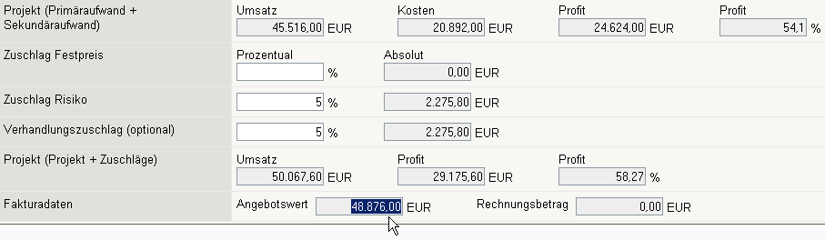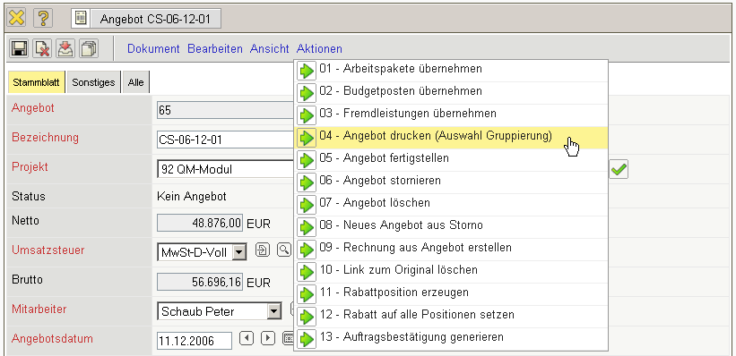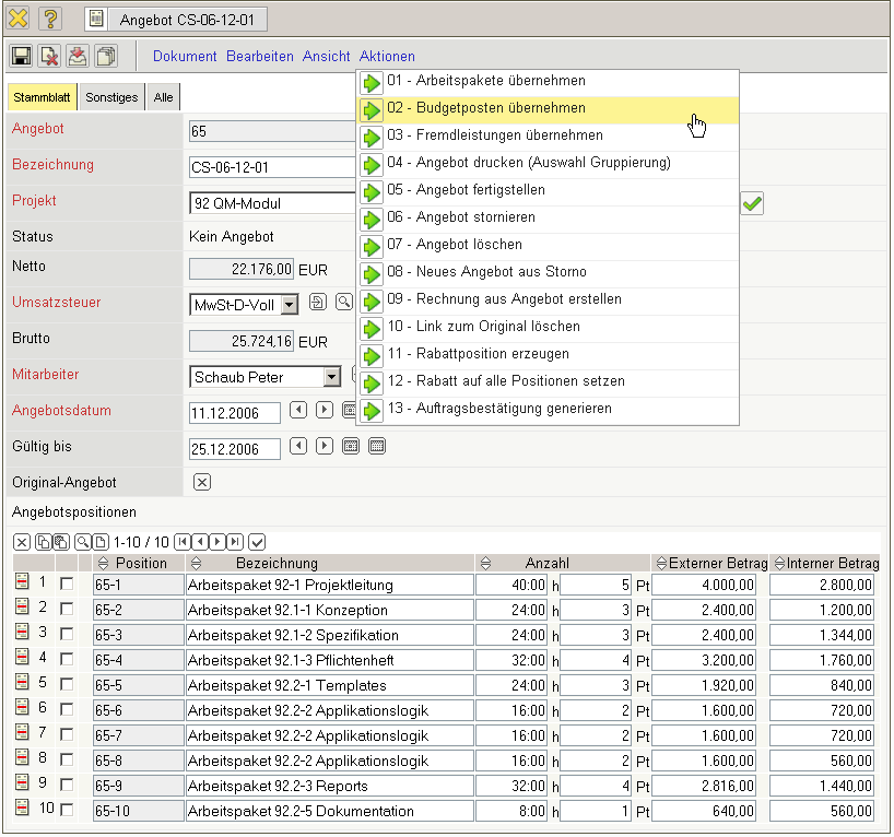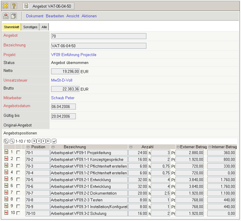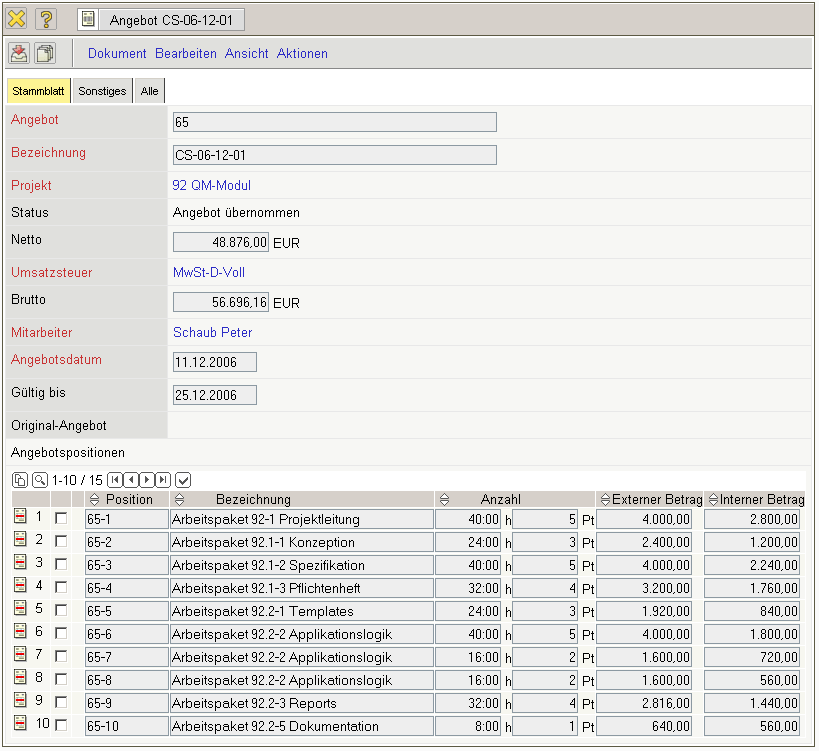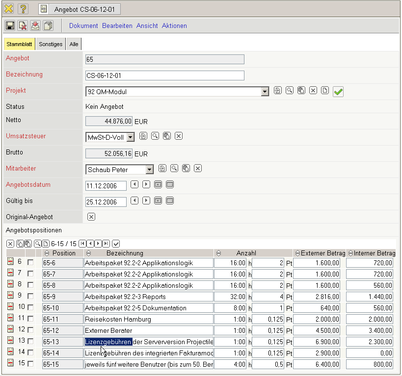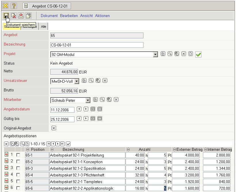 Nach dem Speichern des Angebotes werden die Positionen und der Angebotskopf aktualisiert. Das System verändert dabei automatisch die externen Beträge nach der Preistabelle des Projektes ab und bestimmt den aktuellen Gesamtbetrag des Angebotes.