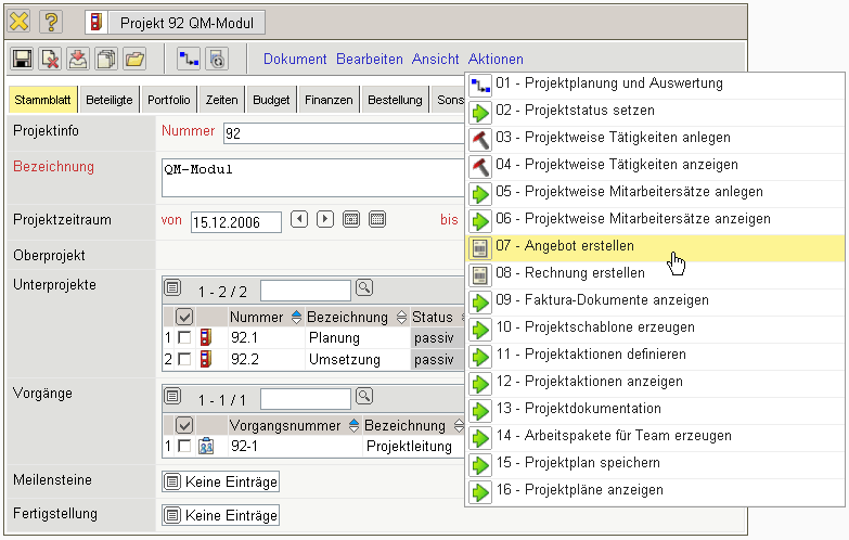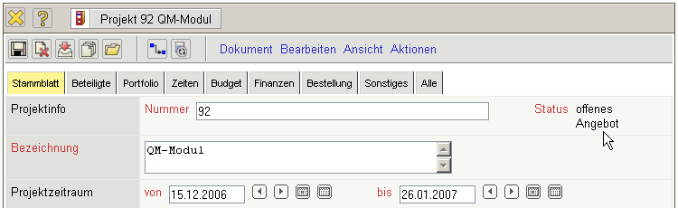 Im Projekt wird dann der Status des Projektes von passiv auf offenes Angebot gesetzt.