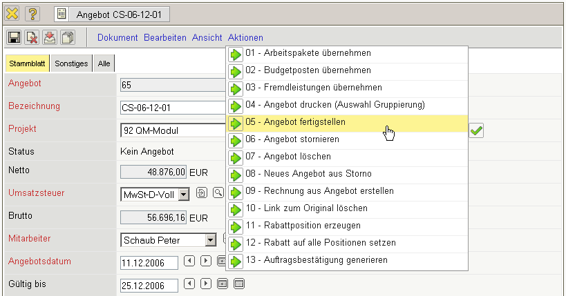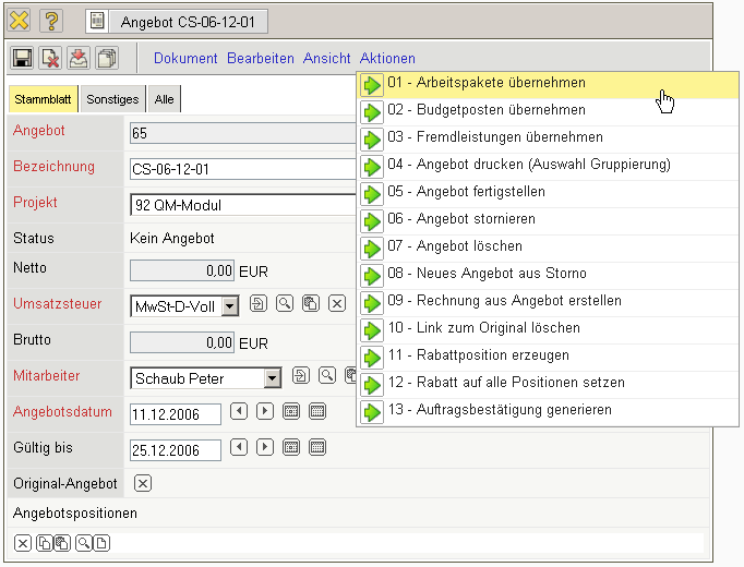 Wenn die Angebotserstellung abgeschlossen ist, muss das Angebot mit Hilfe der entsprechenden Aktion übernommen werden.