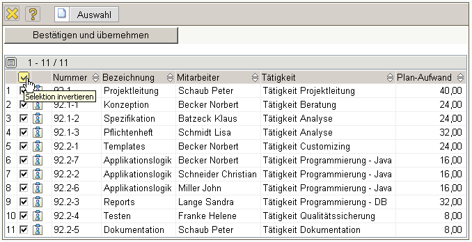 … werden alle Arbeitspakete für das Projekt (inklusive aller Unterprojekte) aufgelistet. Durch Markierung der entsprechenden Positionen und durch Aktivierung der Aktion “Arbeitspakete übernehmen”, werden die ausgewählten Arbeitspakete als Angebotspositionen in das Angebot generiert. Im Beispiel werden zunächst alle Arbeitspakete mit der Funktion “Selektion invertieren” ausgewählt …
