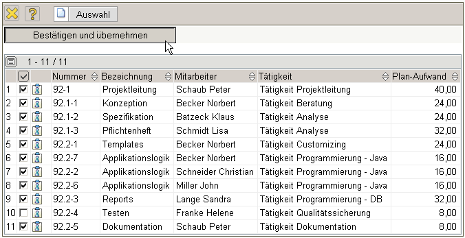 … und anschließend ein Arbeitspaket deselektiert. Im Beispiel unten werden also zehn Arbeitspakte als Positionen in das Angebot übernommen.