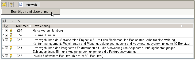 Das System listet alle Budgetposten für dieses Projekt, inklusive der Unterprojekte, auf. Durch Markierung der entsprechenden Positionen und durch Aktivierung der Aktion “Budgetposten übernehmen”, werden die ausgewählten Budgetposten als Angebotspositionen in das Angebot generiert. Im Beispiel unten werden drei Budgets …