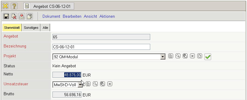 • Status: Dieses Feld kennzeichnet den Status des Angebotes und wird mit dem Wert kein Angebot vorbelegt.