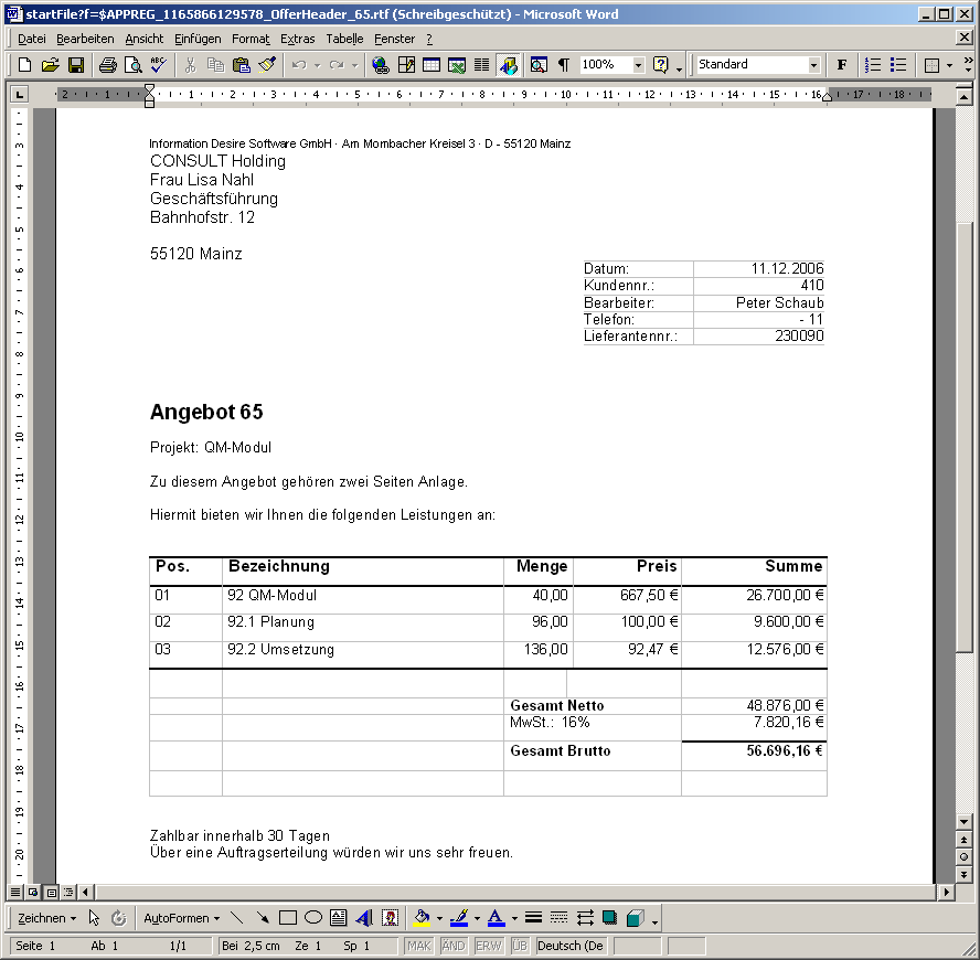 Der Angebotsausdruck kann nun mit Hilfe der Standardtextverarbeitung angezeigt und ausgedruckt werden. Dazu wird die Aktion “Angebot drucken (Auswahl Gruppierung)” betätigt.