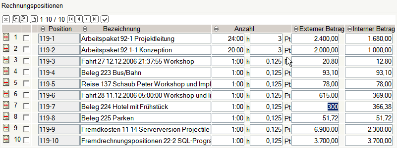 Im Beispiel wurden die Stunden des zweiten Arbeitspaketes auf drei Personentage Aufwand modifiziert und die Position 7 für die Übernachtung auf EUR 300,00 abgerundet. Bei der Manipulation der Zeiten werden die externen Beträge automatisch entsprechend dem Preismodell angepasst.