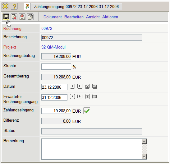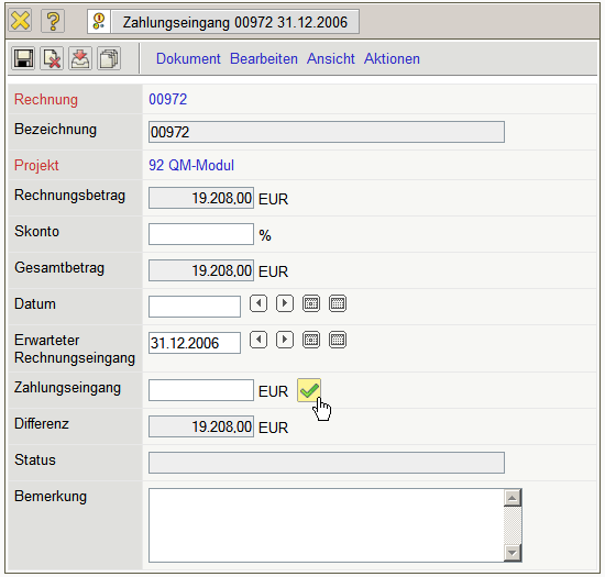 Hier kann bei Zahlungseingang des Kunden für diese Rechnung der Eingang vermerkt werden (auch Teilzahlung). Diese Informationen gehen in die Fakturaauswertung und die Auflistung der offenen Posten ein.