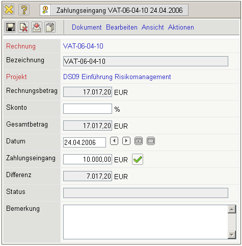 Hier kann bei Zahlungseingang des Kundens für diese Rechnung der Eingang vermerkt werden (auch Teilzahlung). Diese Informationen gehen in die Fakturaauswertung und die Auflistung der offenen Posten ein.