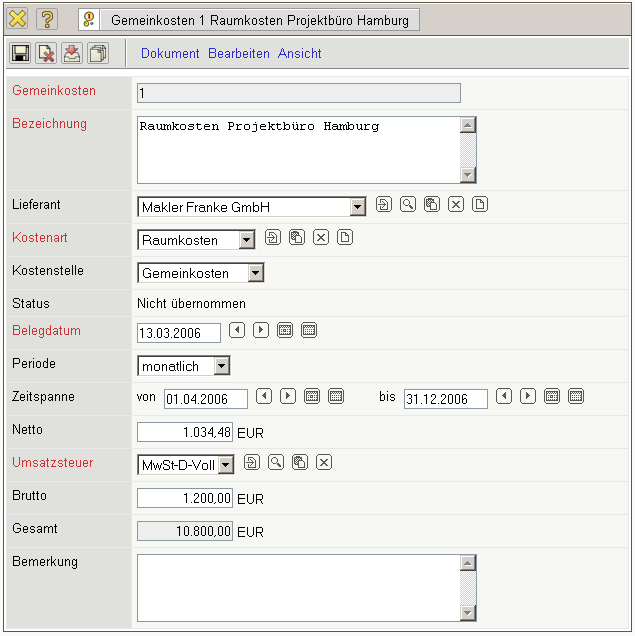 Das Dokument Gemeinkosten verwaltet alle nicht direkten Kosten im System. Dazu gehören beispielsweise Löhne, Raumkosten, Porto, Telekommunikation und alle nicht direkt projektbezogenen Kosten. Diese Kosten können sowohl Einzelbelege darstellen, als auch Belege in Form von periodischen Kosten (wie im Beispiel die Miete für einen Zeitraum als monatliche Gemeinkosten).