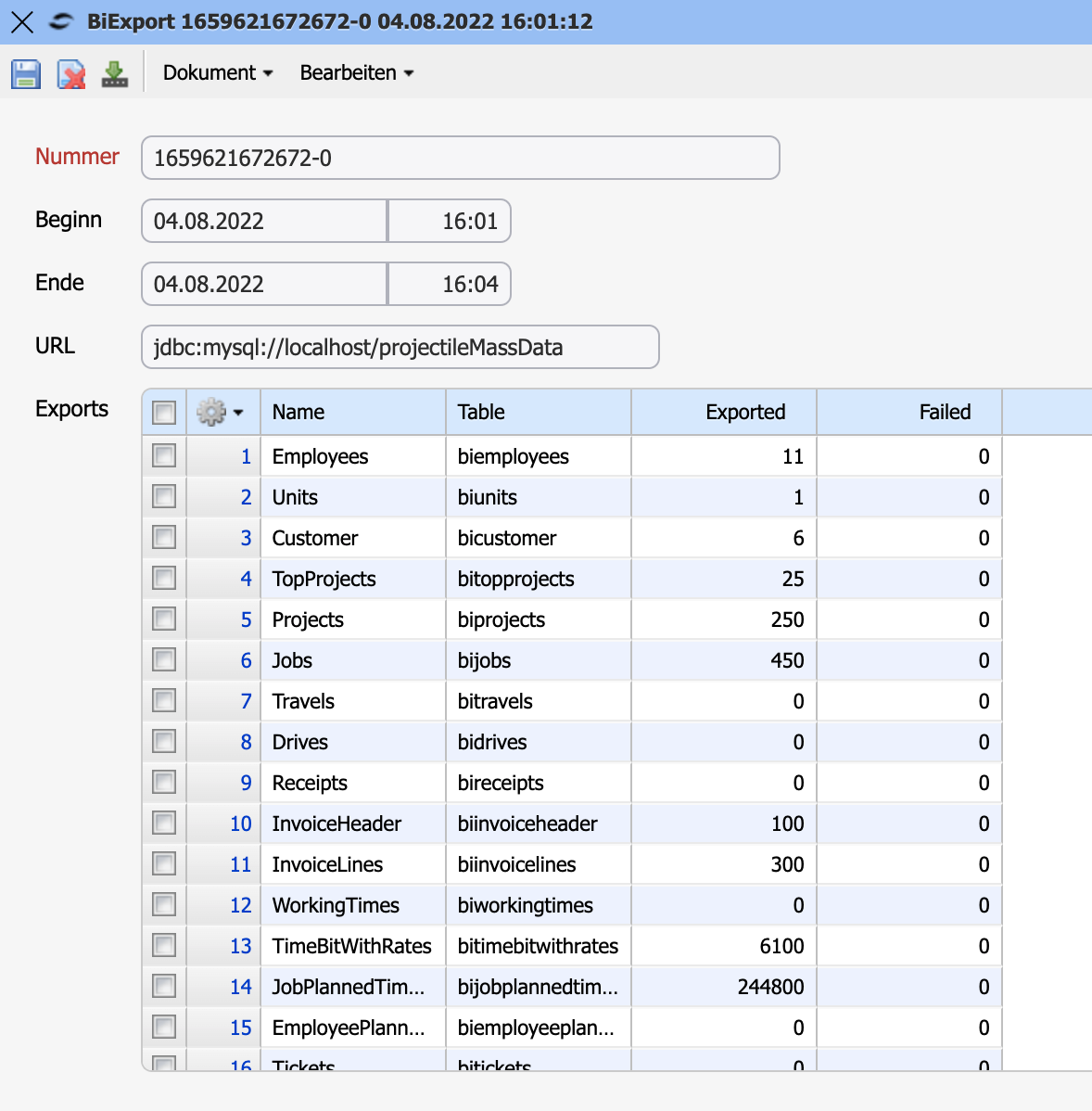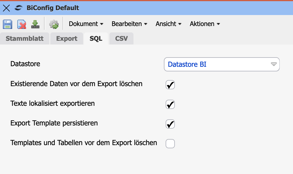 Existierende Daten vor dem Export löschen: in der Regel sollte jede Nacht eine neue Kopie der Daten erstellt werden und vorher alle Exports gelöscht werden. Man kann aber auch mehrere Exports in die BI-Datenbank ablegen.