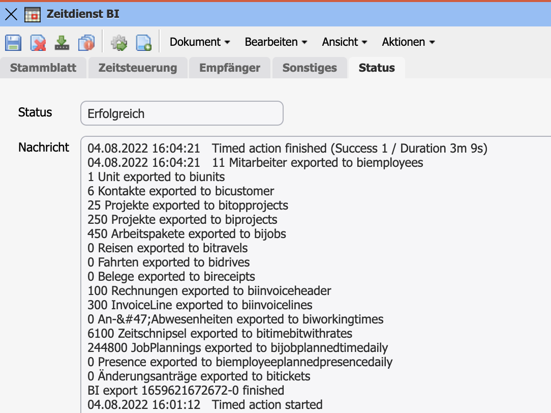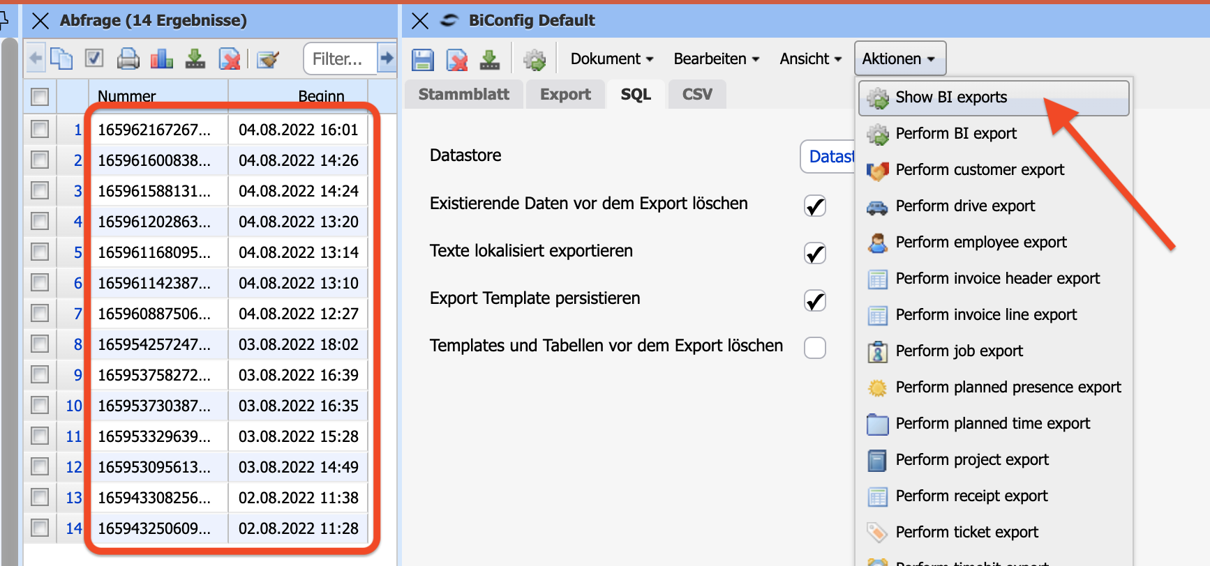Direkt im Dokument der Export-Konfiguration kann man die gelaufenen Exporte über die Aktion „Show BI exports“…