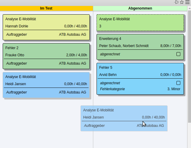 Hier sehen Sie, wie ein weiterer Task von der Spalte “im Test” in die Spalte “Abgenommen” gezogen wird. Da in dieser Spalte “Tasks gruppieren” aktiv ist…