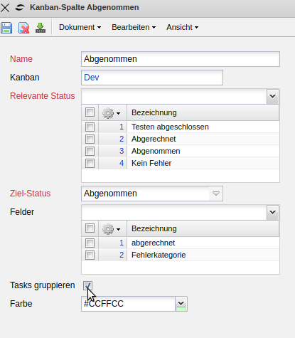 Diese Einzel-Tasks lassen sich in einer bestimmten Spalte zu einem Stapel zusammenführen, wenn in der Spalte das Flag “Tasks gruppieren” aktiv ist.